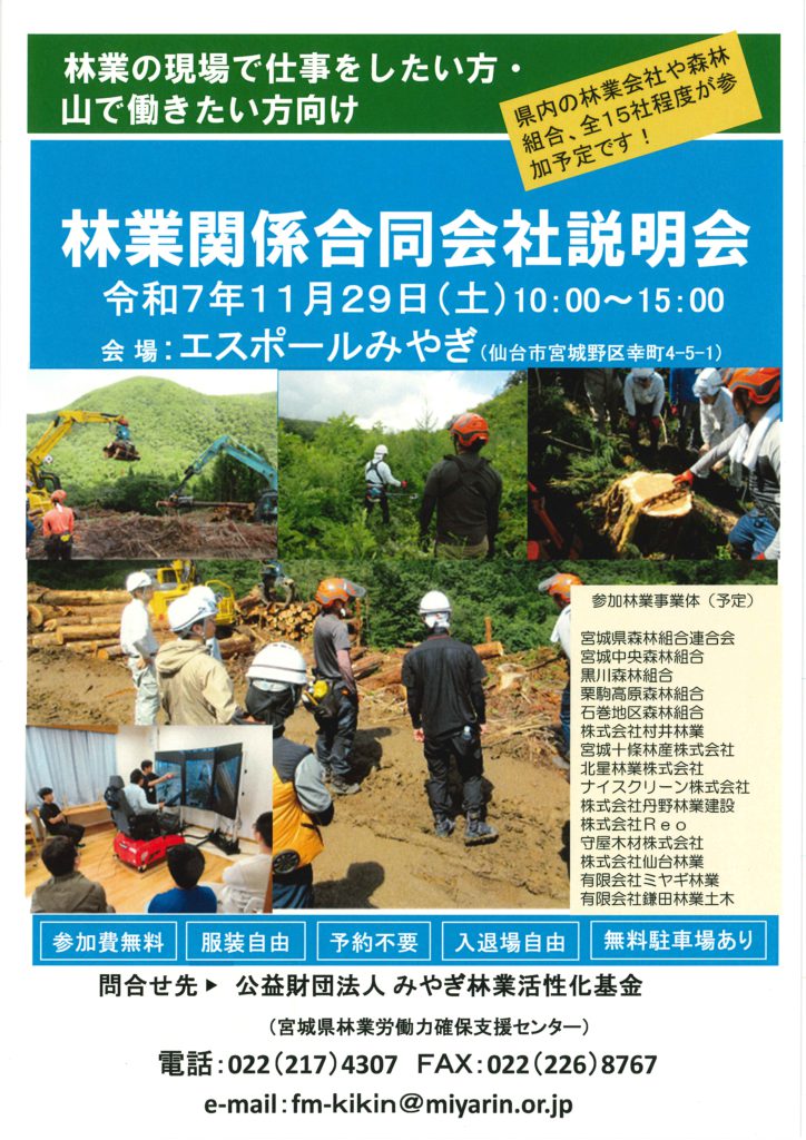 林業は大切な森林を守り・育てる産業であり,社会的にも地域にとっても大変やりがいのある重要な仕事です。今般,㈶みやぎ林業活性化基金(宮城県林業労働力確保支援センター)では,その担い手となる方々の就業を支援する「合同会社説明会」を開催します。